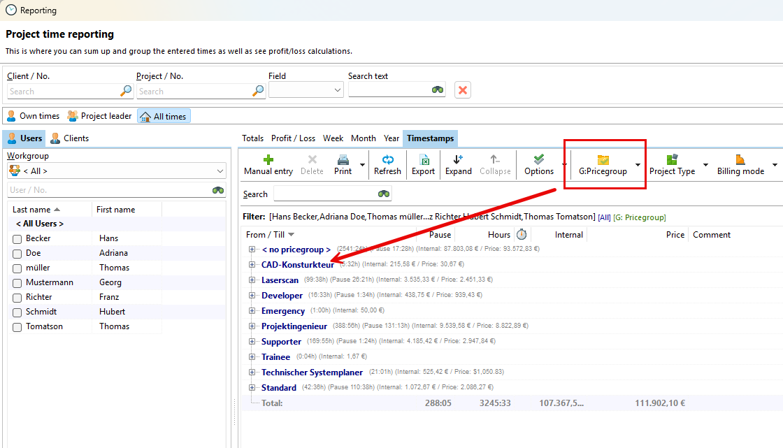 In the evaluation, you can group the individual times by price group. This gives you a better overview of the price groups used.