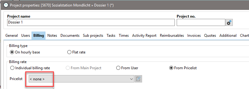 The subproject has the setting "From price list" --> without a set price list in the project properties under the "Billing" tab.
