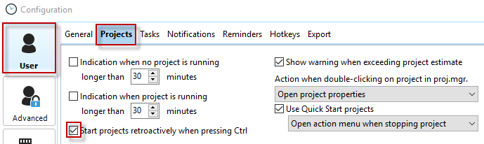 First, activate the "Start projects retroactively" option in Configuration -> User -> General.