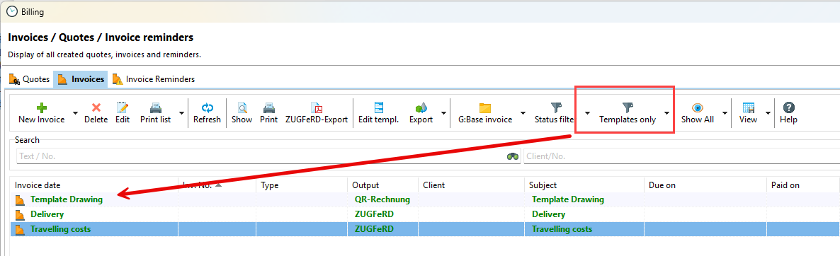 Once you have saved the template, it will be displayed in the invoice overview: