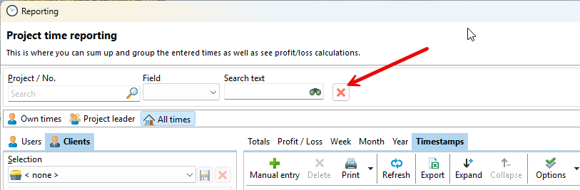 Above your results list, you can see which data you have filtered in the "Filter" line. In our example, you can see all the times recorded by the employee Michaela Meier selected on the left-hand side, summarized by project (S: Project) and grouped by customer (G: Customer). Below the graphic buttons, you can also see the selected options again (S: Project and G: Customer). If you want to apply the filter to all employees, select "All employees" on the left-hand side. |