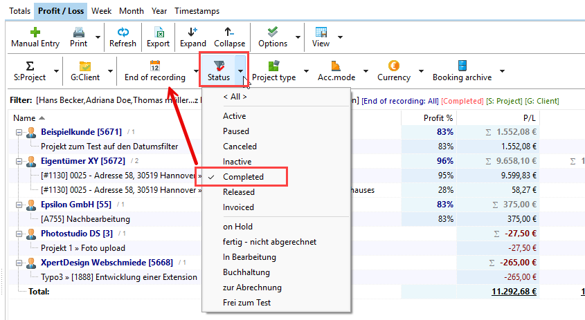 If you filter by status for completed, approved, or billed projects, the original filter changes from "Project created" to "End of entry." The date of the end of entry is set via the status. The date on which the project status was set to Completed, for example, is also the date that is entered in the "Actual end" (end of entry) field.