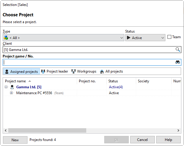 You will find this dialog box throughout the program when you select projects. If you check the "Team" box, only team projects will be displayed.