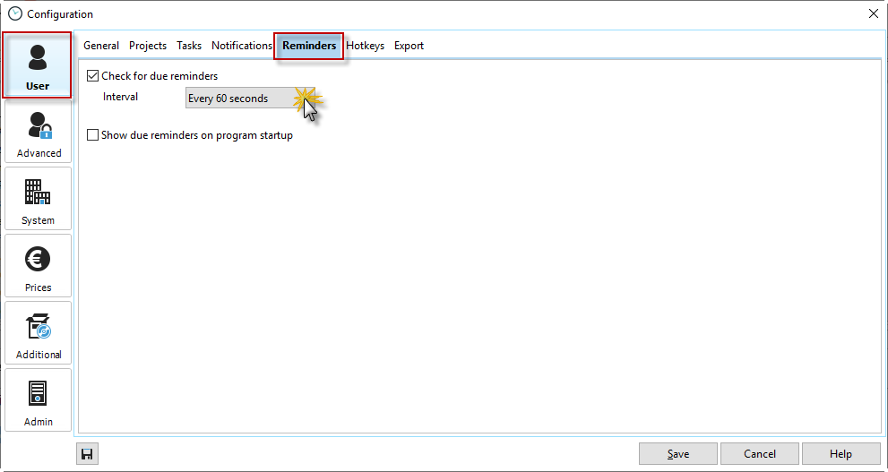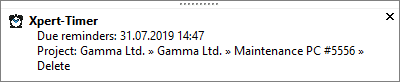 In the configuration under "Users" -> Reminders, you can set the query interval for your reminders. There you can also decide whether you want to display your due reminders when you start Xpert-Timer.