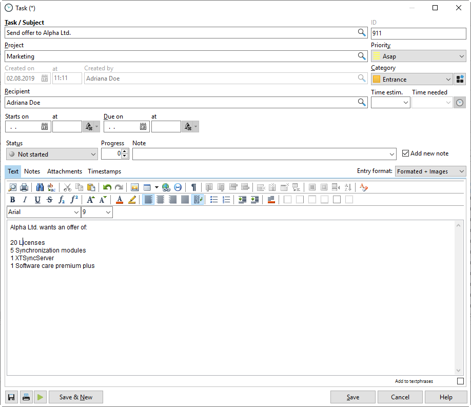 Finally, enter a detailed description of your task. You can also use text modules, which you can define in the configuration. Right-clicking in the text area gives you additional options, e.g., to insert the user name, date, or time.