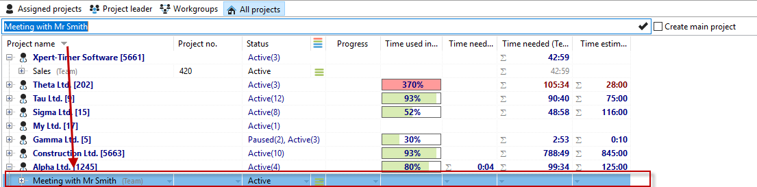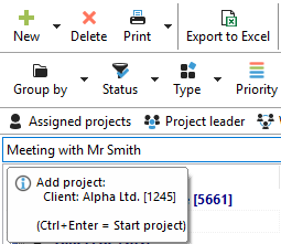 Please note that the project that is currently highlighted in blue in the Project Manager, i.e., "selected," is always used as the basis for creating the task. In the example below, the focus is currently on the project "Meeting Project XY." |