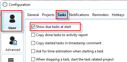 In the configuration, under the "Tasks" tab, you can specify whether you want to be informed about your open, due tasks when you first start Xpert-Timer.