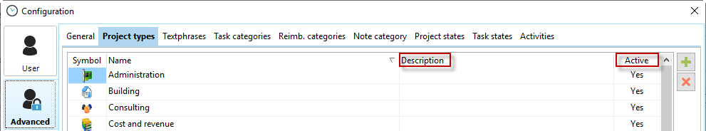 You can add a short description for each project type. To do this, simply click in the description field. To maintain an overview in the Project Manager, you can also deactivate some project types.