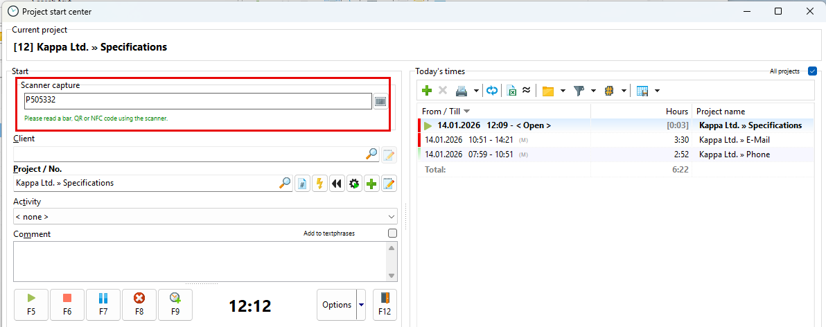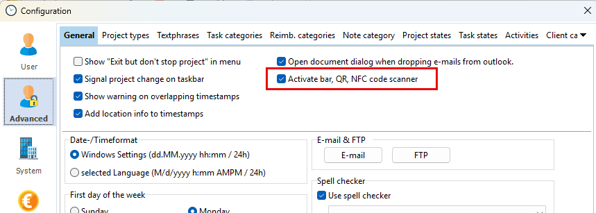 To start or stop projects with a barcode scanner, you must first activate the function in the configuration. You will find the setting in the "Advanced" section of the "General" tab.