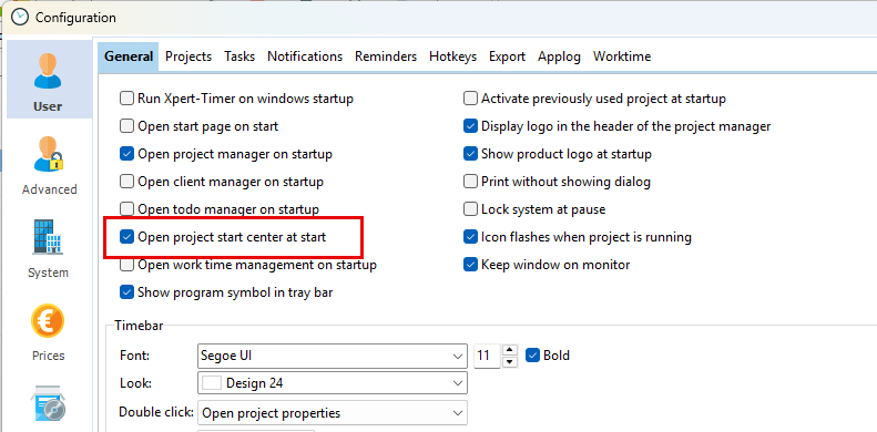 The Xpert-Timer configuration is set so that the start center opens when the program is launched.