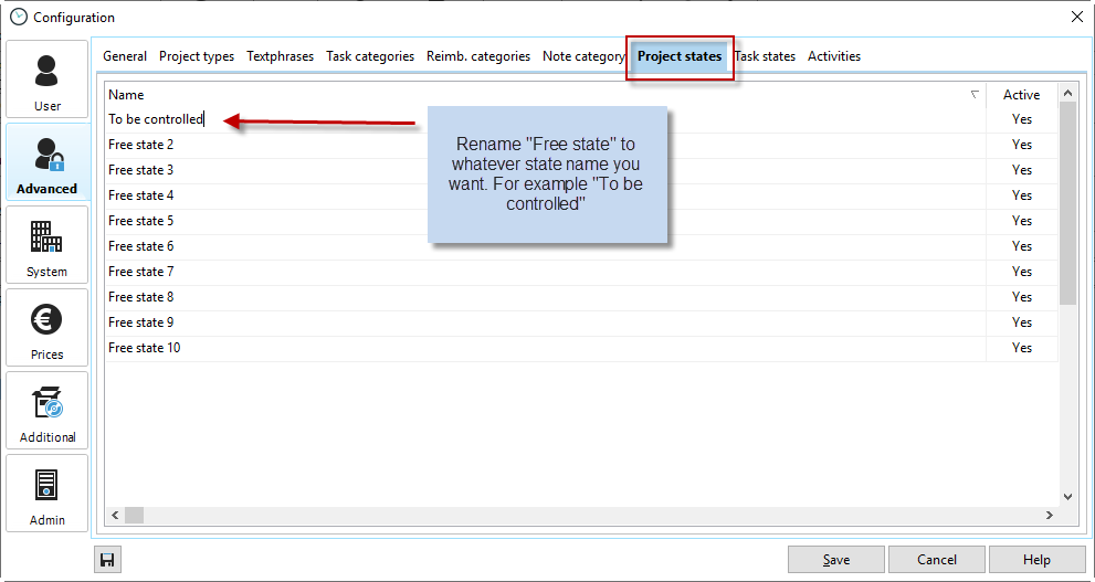 You can assign the free project statuses in the configuration in the "Project status" tab. You can easily customize the status text by clicking on a line.
