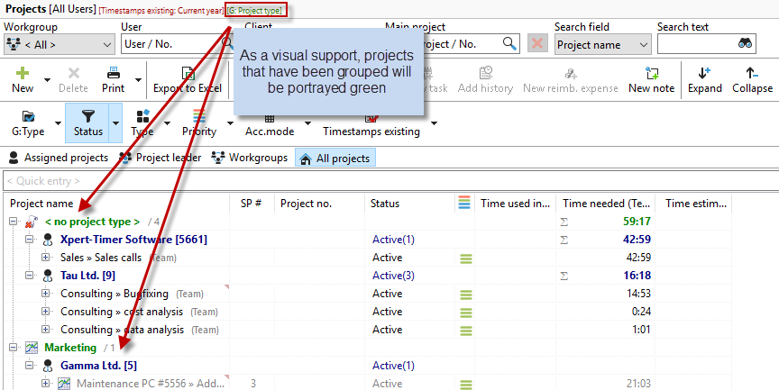 When you select a grouping, your recorded times are displayed in "green." This is only for visual support so that it is immediately apparent that a grouping has been selected. In our example, we have grouped the project list by "project type."