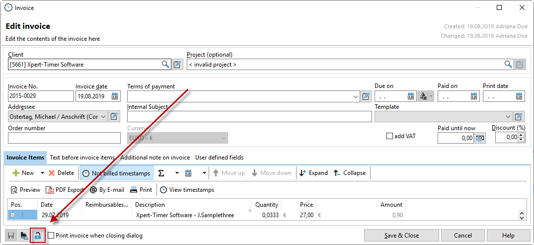 Please note that if you change the price manually, the calculated costs in Xpert-Timer will no longer match the total price of your invoice. |