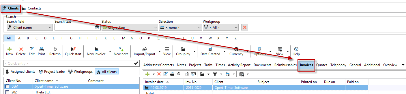 If you now double-click on the customer, you will see the invoice listed in the "Invoices" tab.