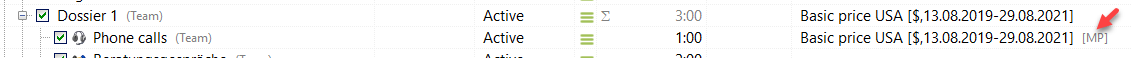 In this case, the price list of the main project is used. This is also indicated by an [MP] (main project) in the Price list column in the Project Manager.