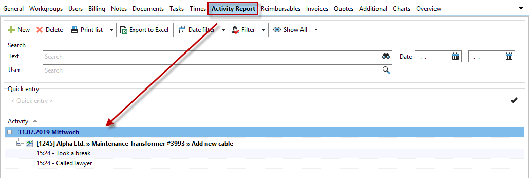 You can also make entries retrospectively in this dialog. To do this, type the completed activity in the field provided, insert the correct date, and click on the button with the green plus sign