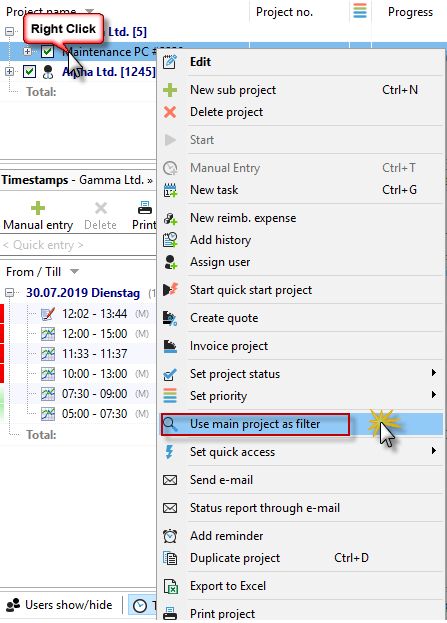 If you already have a large number of projects in your project manager, you should get into the habit of using the project search function. This intelligent search allows you to enter part of the project name or project number and provides you with the corresponding results.