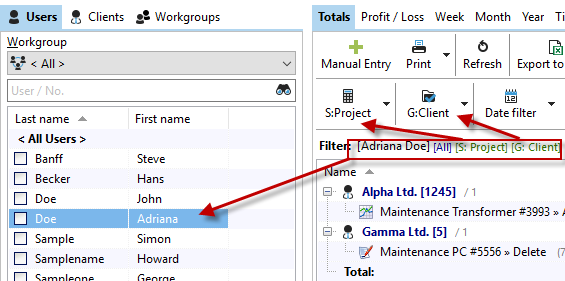 Above your results list, you can see which data you have filtered in the "Filter" line. In our example, you can see all the times recorded by the employee Michaela Meier selected on the left-hand side, summarized by project (S: Project) and grouped by customer (G: Customer). Below the graphic buttons, you can also see the selected options again (S: Project and G: Customer). If you want to apply the filter to all employees, select "All employees" on the left-hand side. |