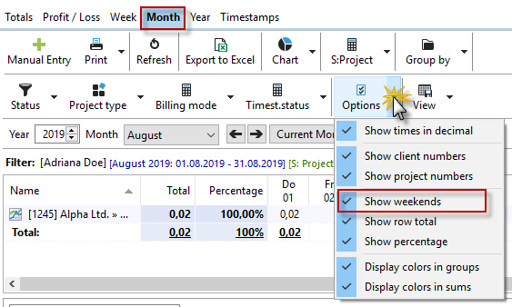 The "Options" menu item provides you with additional settings. The "Show weekends" option is important here if your employees also work with the system on Saturdays or Sundays.