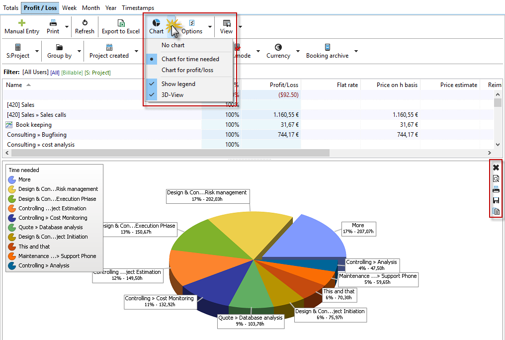 The profit/loss is calculated as follows: Flat rate or price on an hourly basis ./. Employee costs +/- Services P/L In |