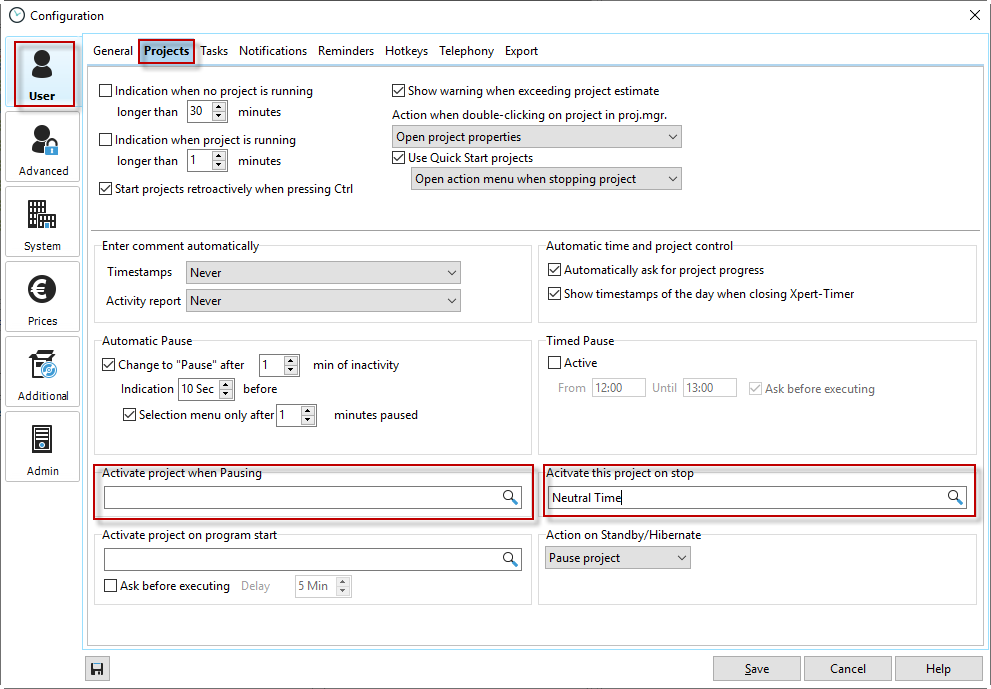 If you want to achieve complete recording of activities throughout the day, you can specify a so-called break and stop project in the configuration. This break or stop project serves only to fill gaps in time recording. The project should be seen as a "gap filler" for idle times. Automated functions such as the comment query are not intended for this purpose.