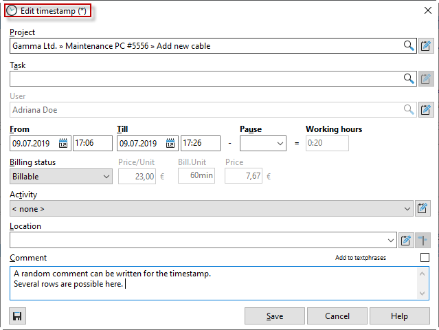 This dialog box allows you (if you have the "Edit project times" right) to correct your previously recorded project times or add an extended comment.