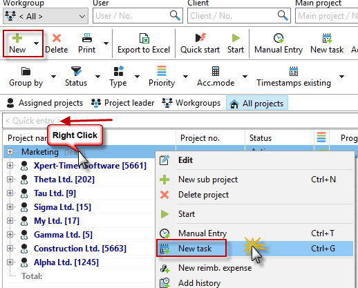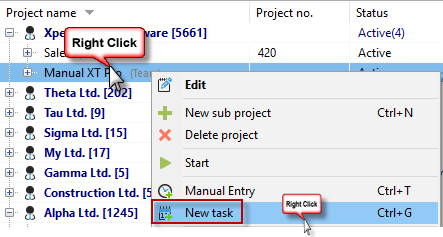 Xpert-Timer always tries to understand for which project you want to create the task. In our example screenshot, if we right-click on the blue-highlighted project "Manual XT Pro" in the Project Manager and select "New Task," we would create a task related to the project "Manual XT Pro."