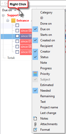 You can show or hide columns by right-clicking on a column header in your task list. As in the rest of Xpert-Timer, all columns that you show will also be printed.