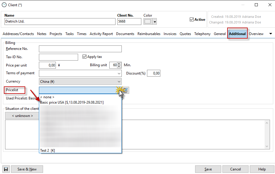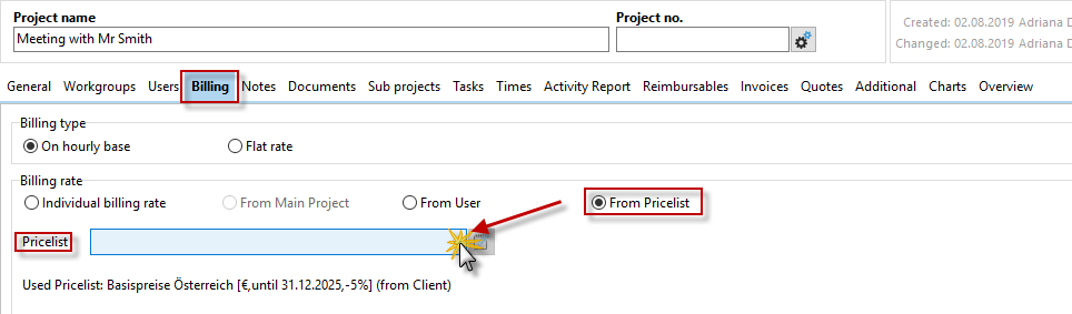 In the project properties, you will find the price list selection in the "Billing" tab.